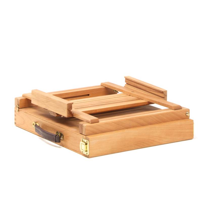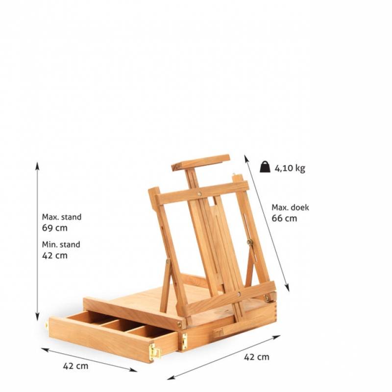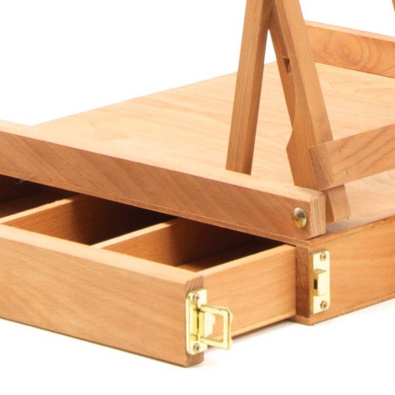 Deze tafelezel met kist is gemaakt van duurzaam beukenhout. Een ideale oplossing voor de schilder die vaak van locatie verwisselt of weinig ruimte heeft. Hij is uitgerust met een uitschuifbare opbergbak.